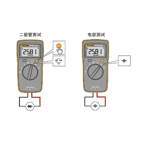 采用“RC充放电计时法”,FLUKE101Kit内部提供固定频率方波信号,通过开关电路控制被测电容充放电,测量充放电时间常数τ=RC(R为内置标准电阻),进而推导电容值C=τ/R。不同量程通过切换标准电阻实现:低电容量程选用小阻值电阻,避免充放电时间过短;高电容量程选用大阻值电阻,提升测量效率,测量后需等待最长18秒确保读数稳定。TL75表笔的探针接触面积适中,适合常规电容引脚测量,配合SmartStrap挂带支撑仪器直立放置,方便观察读数稳定过程,减少因手持仪器导致的视角偏差。需注意,50nF量程可能因测试导线电容引入最大1.5nF误差,实际使用中可通过校准优化。